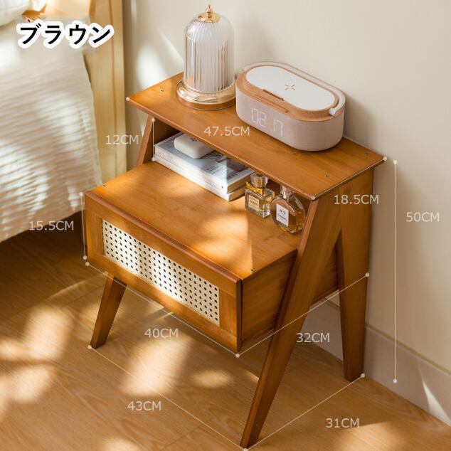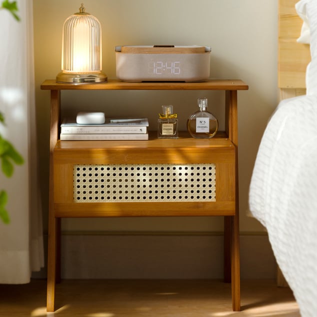 竹製フレームとラタン調素材が調和したナチュラルな雰囲気のベッドサイドテーブルです。