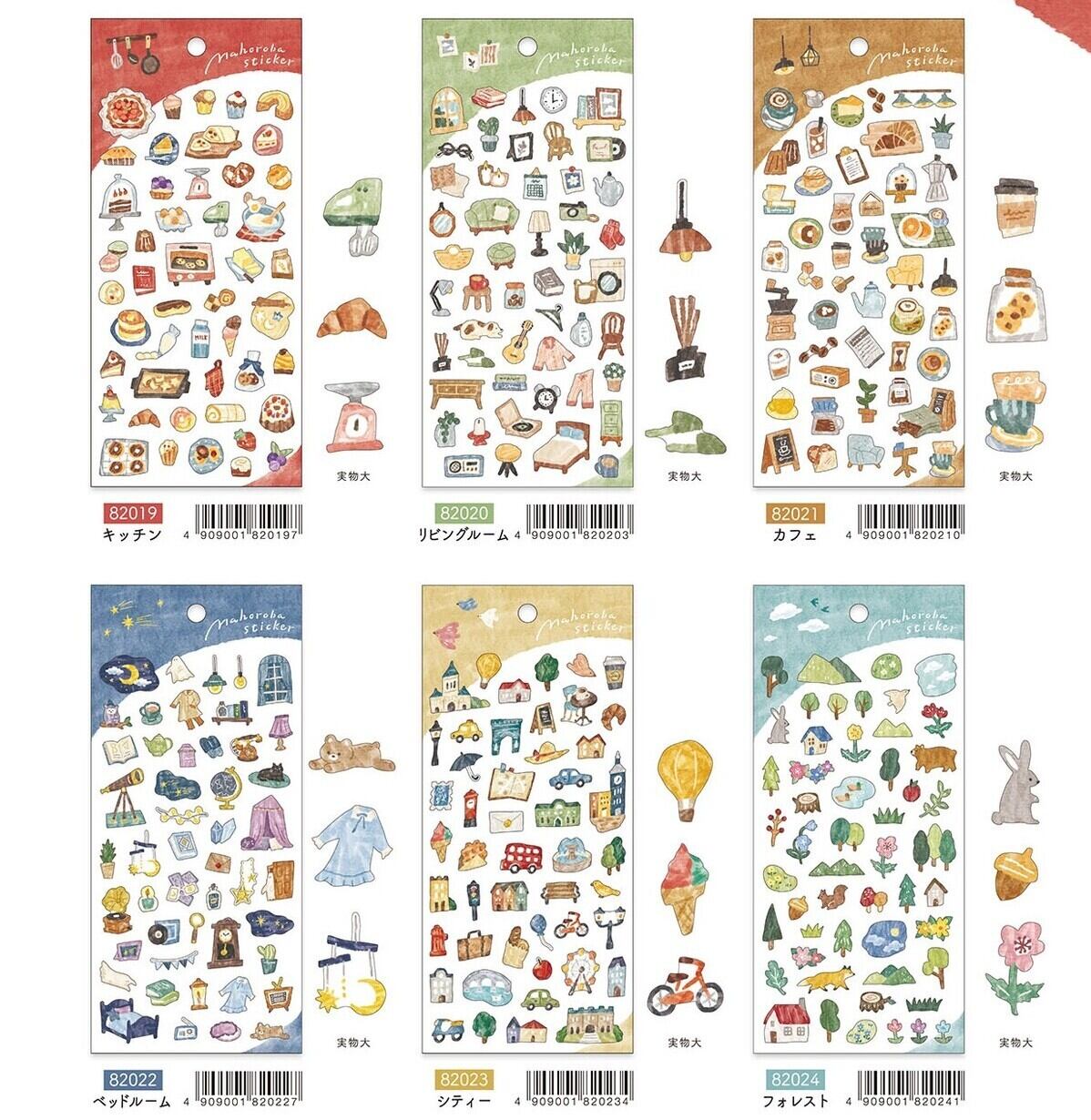 異なる部屋をモチーフにした、手描きタッチのダイカットイラストシールです。