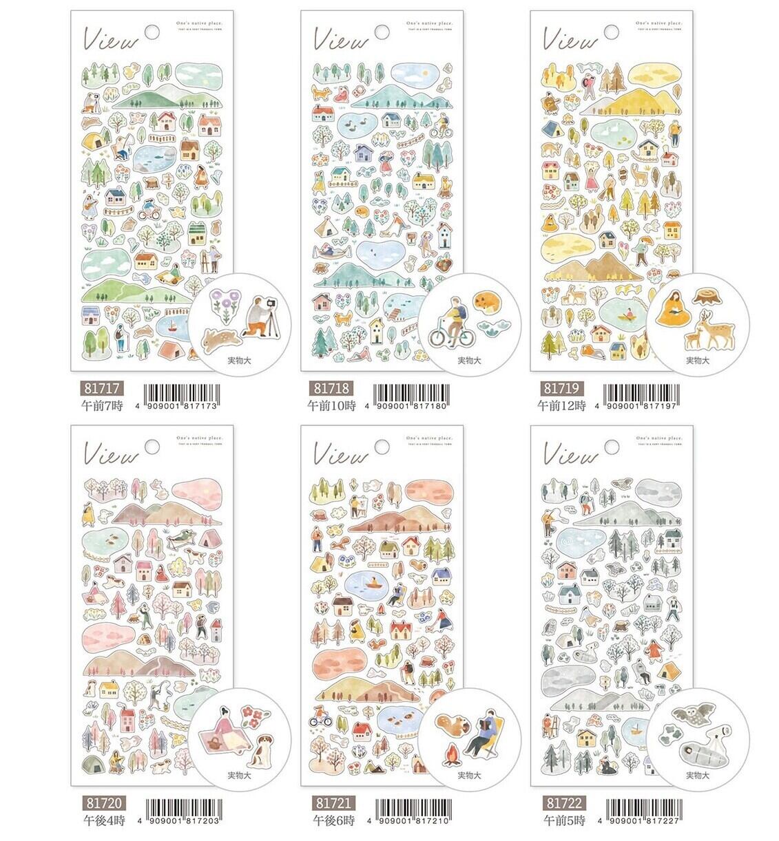 時間帯によって移り変わる景色を描いたイラストシールです。