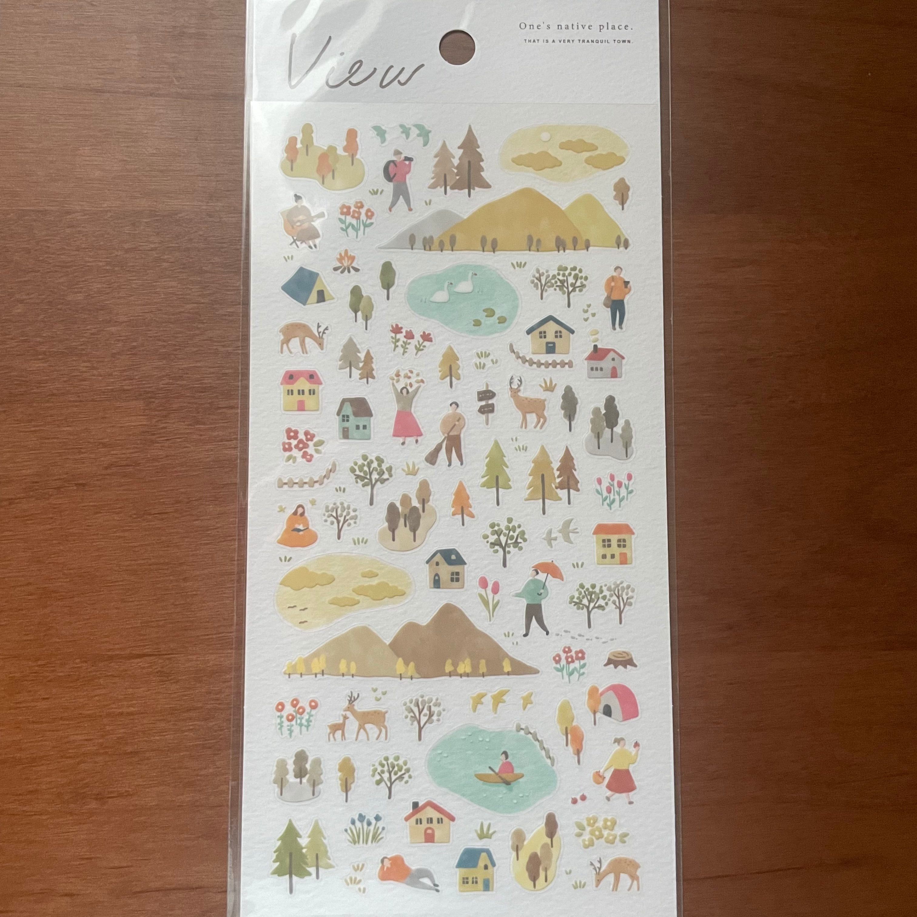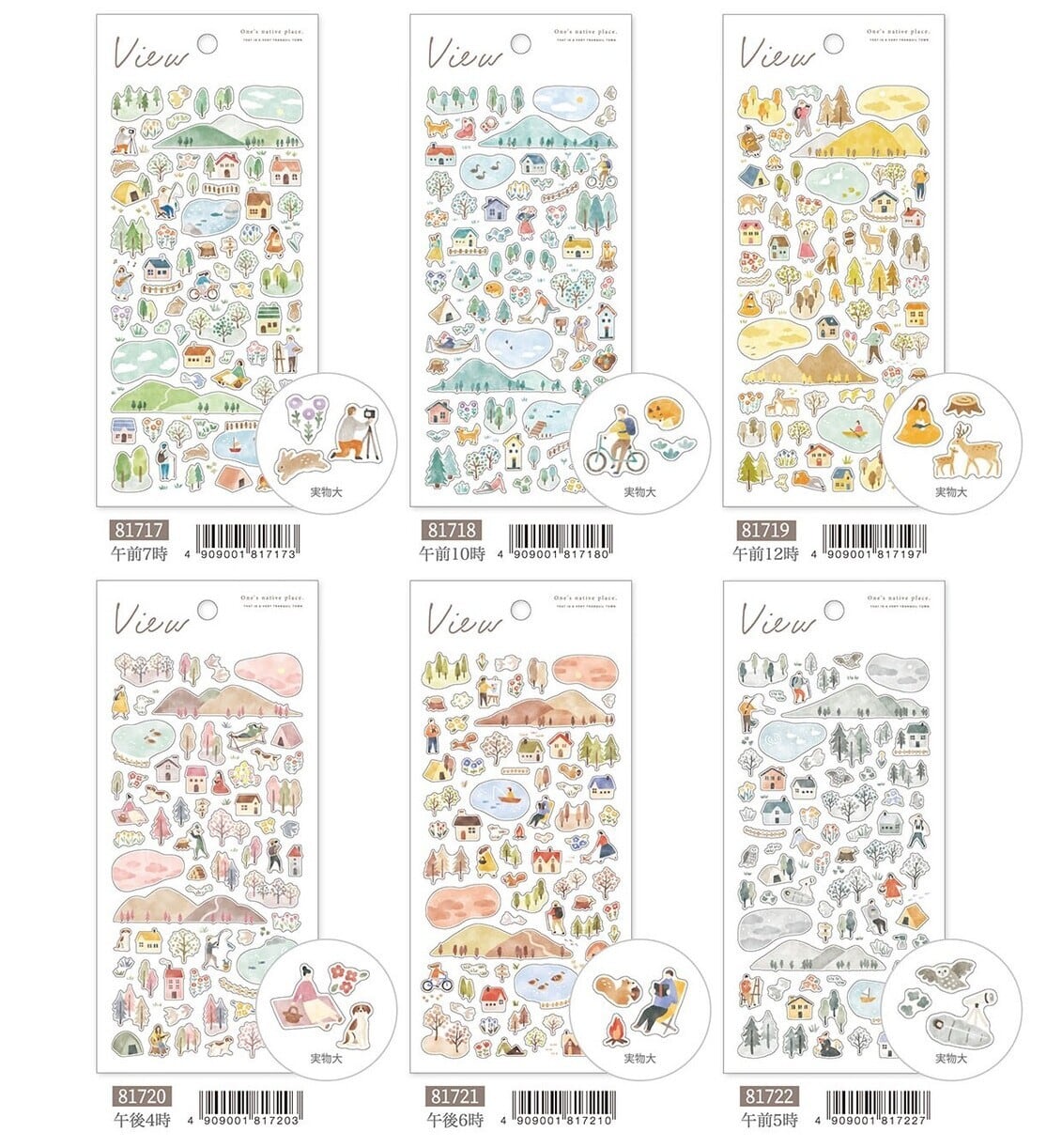 時間帯によって移り変わる景色を描いたイラストシールです。