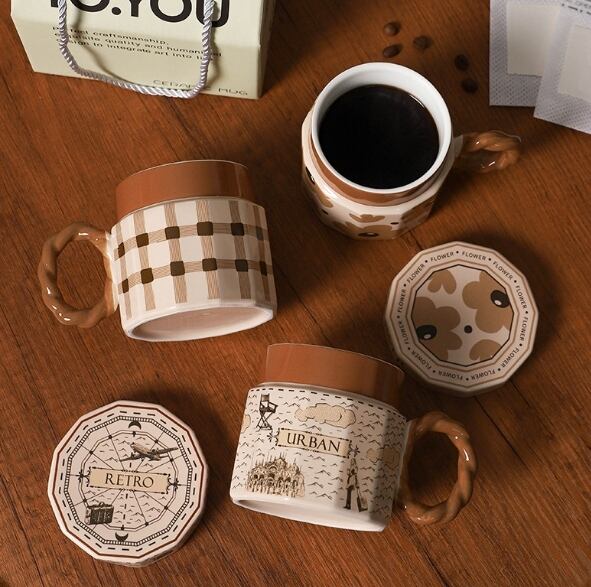 マグカップ/カフェ/コップ/陶器/コーヒー/韓国風/雑貨/食器/ブラウン/チェック