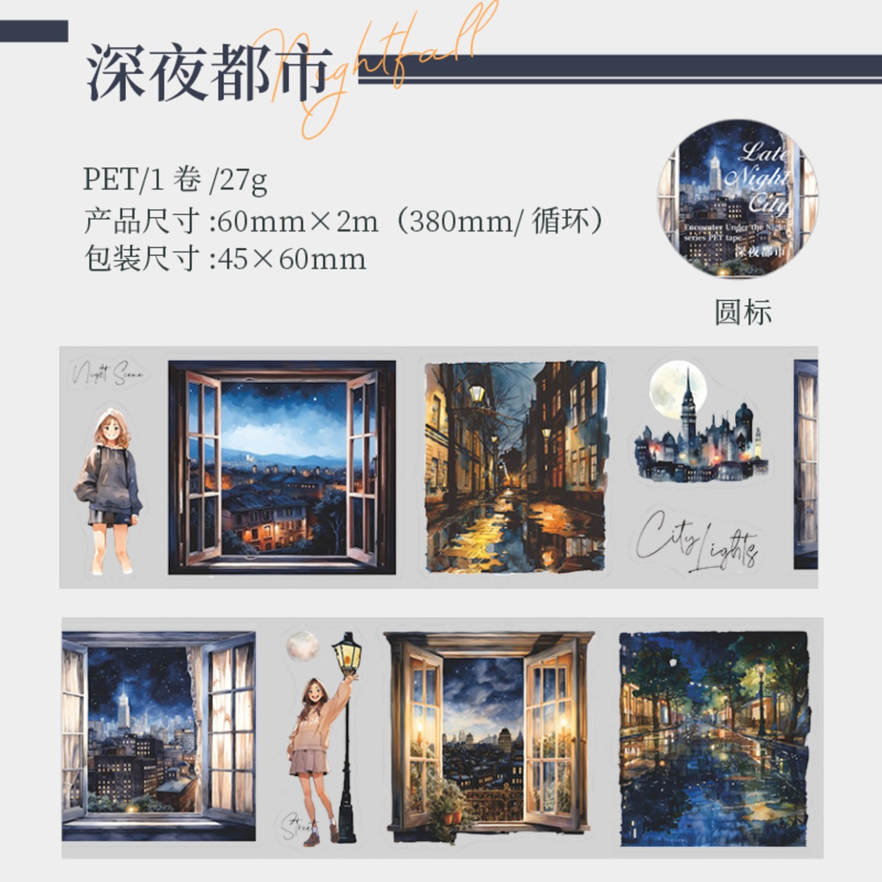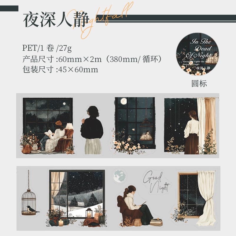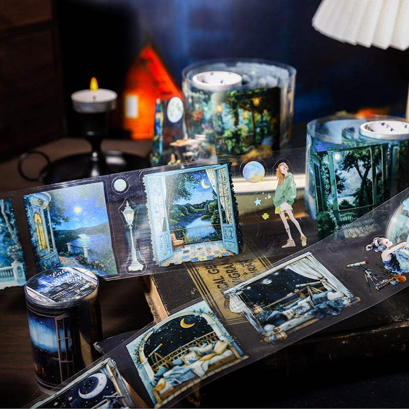 夜の静かな雰囲気の風景と女の子のPET素材のロールステッカーです。