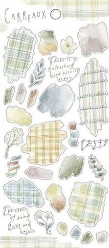 文字やモチーフを引き立てるチェック柄、水彩風タッチのシールです。