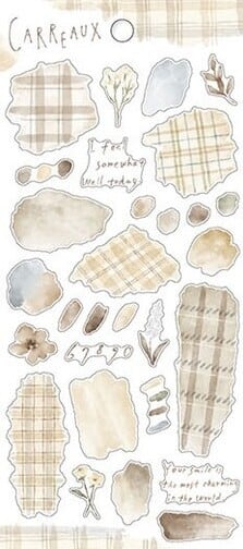 文字やモチーフを引き立てるチェック柄、水彩風タッチのシールです。