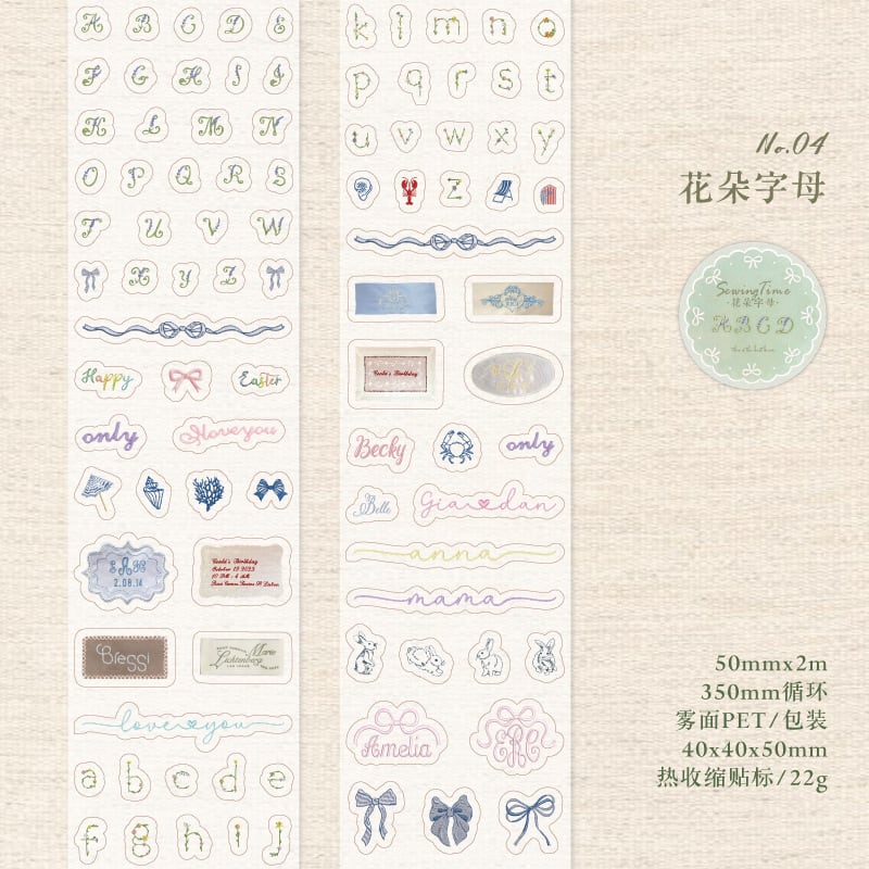 刺繍や布風のデザインがかわいい、PET素材のロールステッカーです。