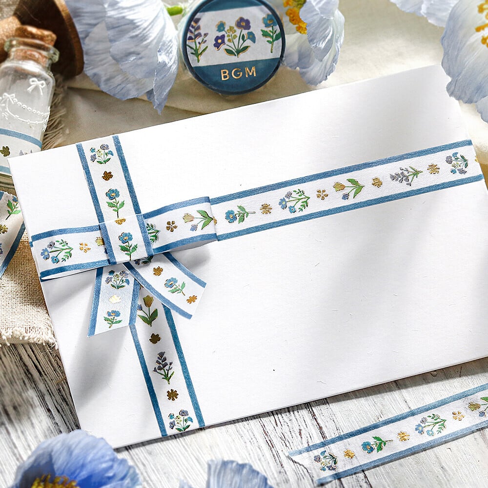 日常使いしやすい、控えめなカラーリングの花柄リボンのマスキングテープ。
