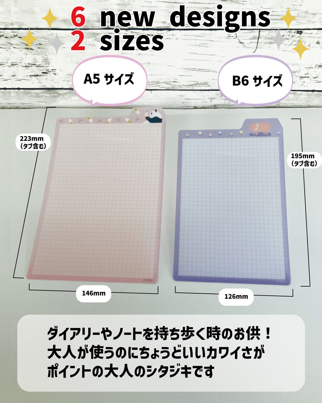 手帳やノートに挟んでおくと上部にはみ出るインデックスが目印になってキュートな下敷きです。