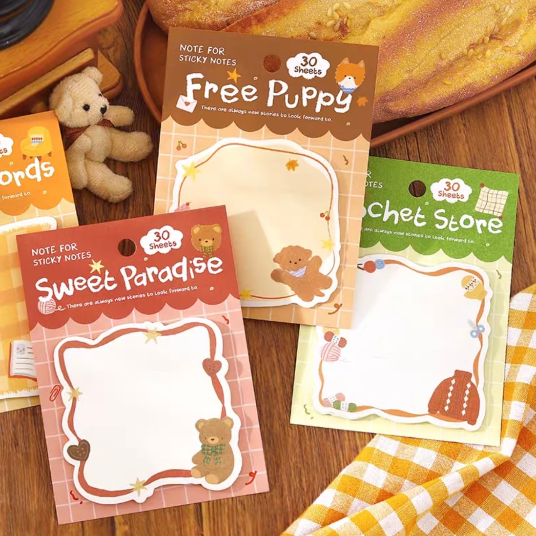 くまや子犬、ニットなど、ふわふわなものたちを集めたダイカットふせん。