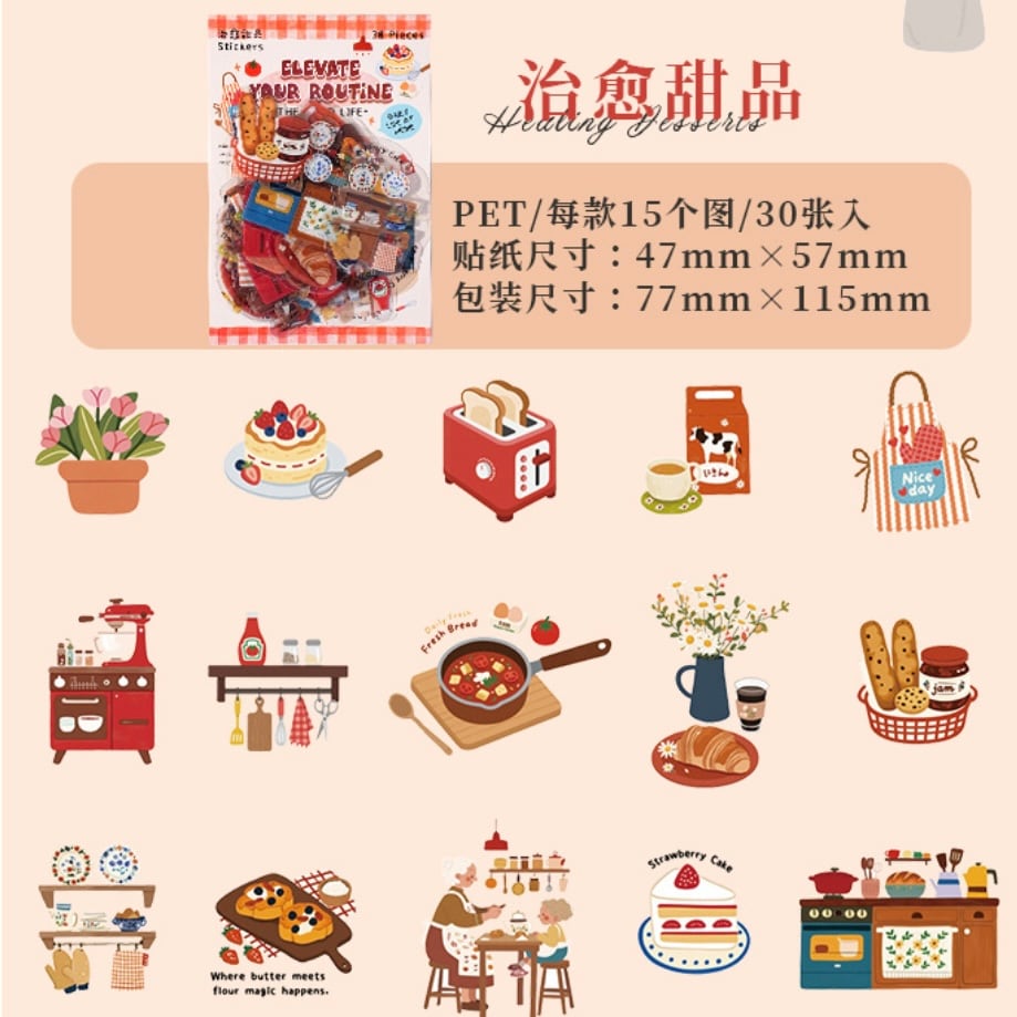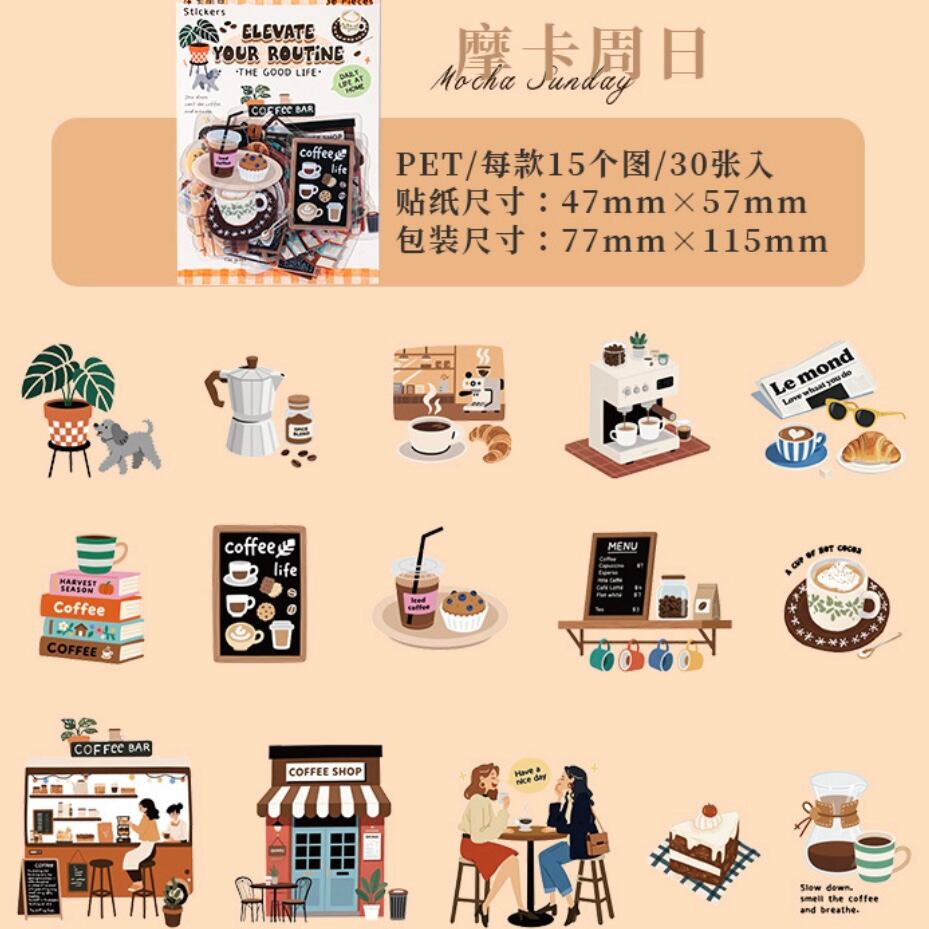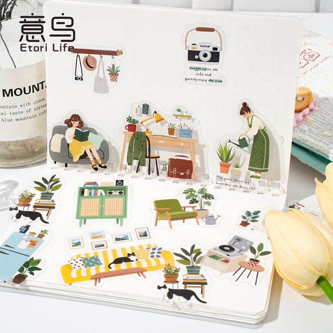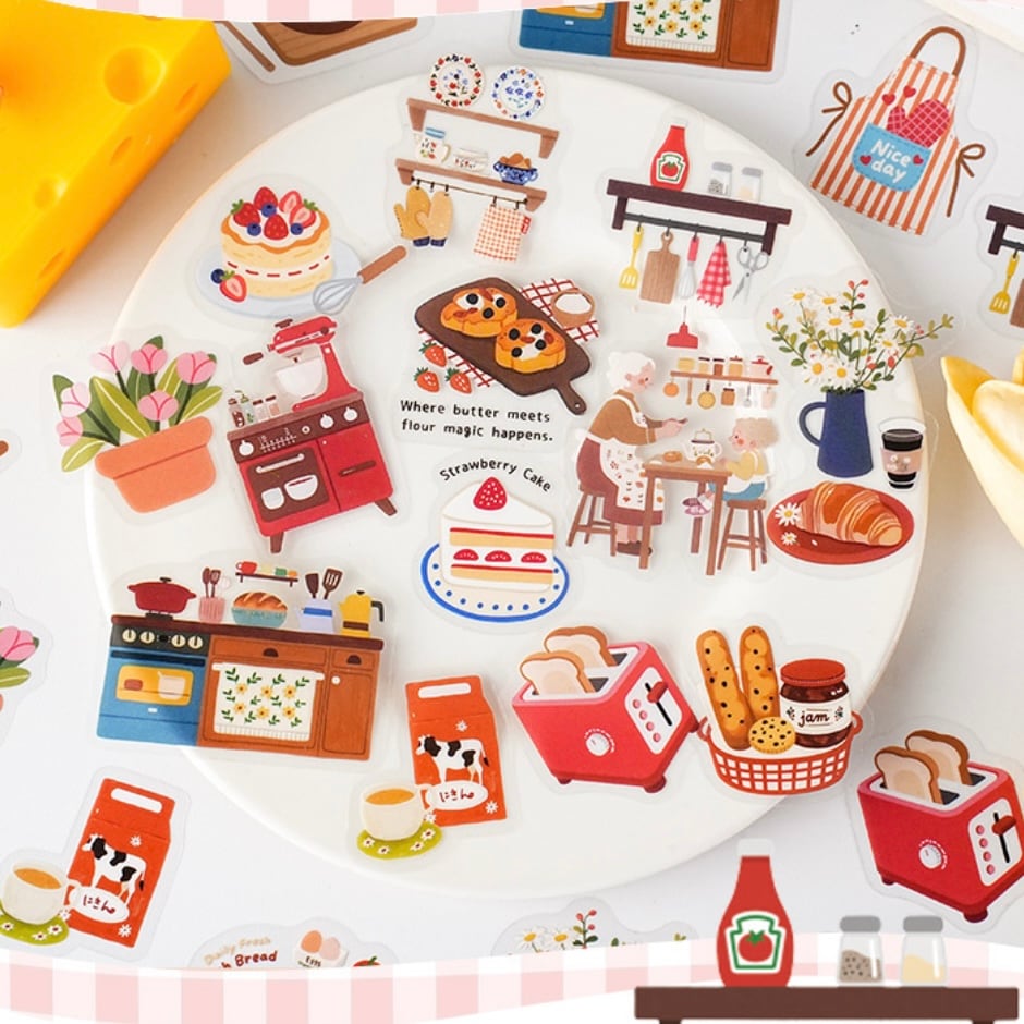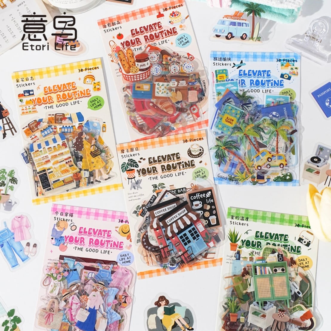 それぞれ日常生活のシーンを切り取ったデザインのPETフレークシール。