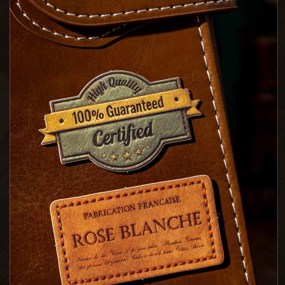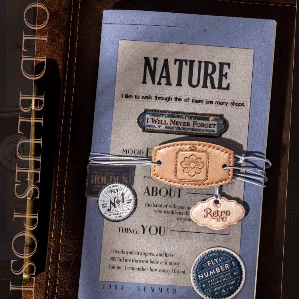 ヴィンテージ感のあるレザー風タグデザインのフレークシール。
