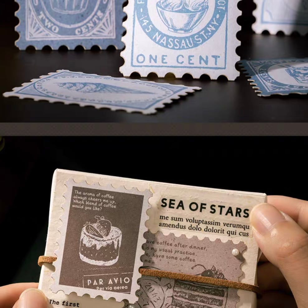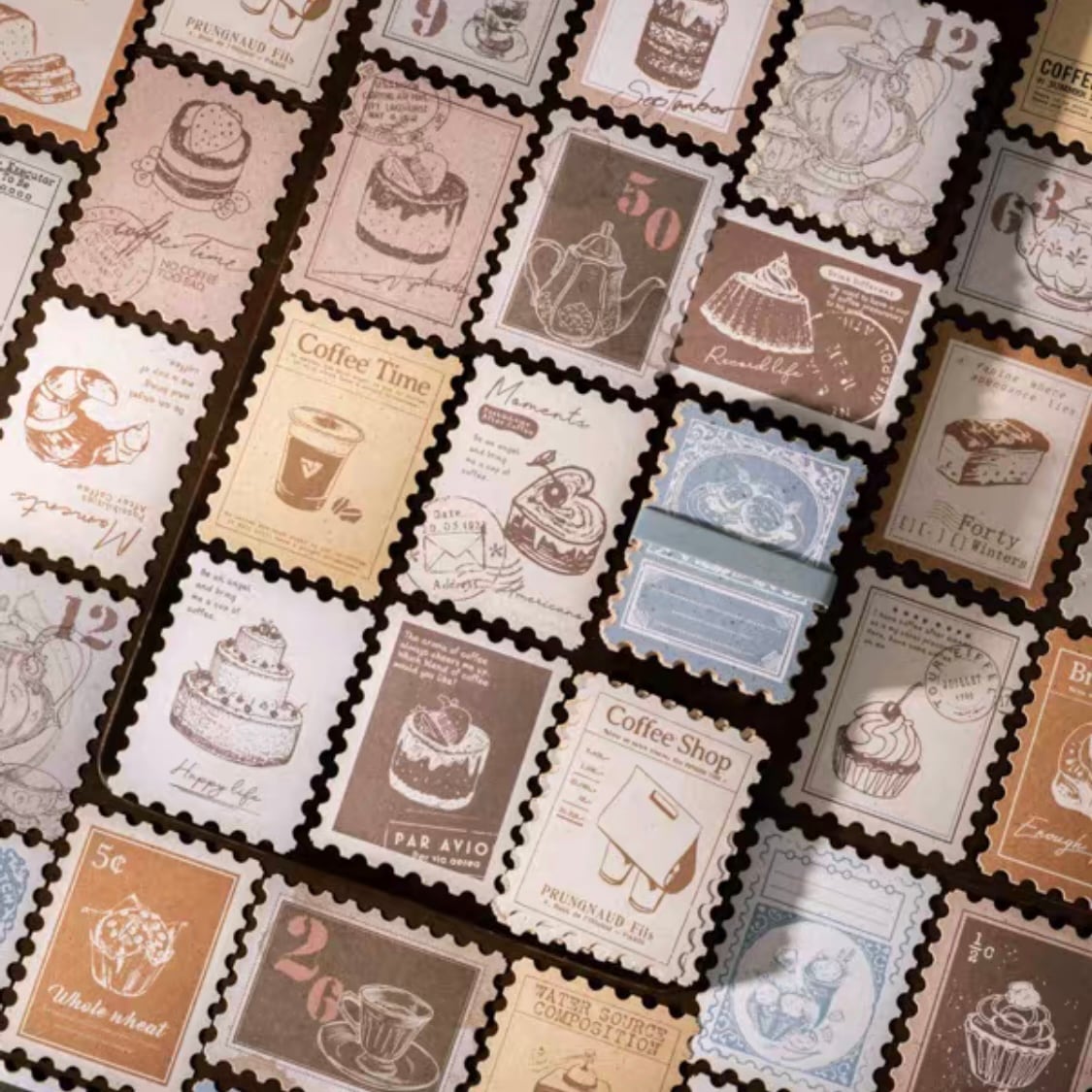 アンティークな海外の切手風デザインと、スイーツやカフェモチーフが大人かわいい、切手型フレークシール。
